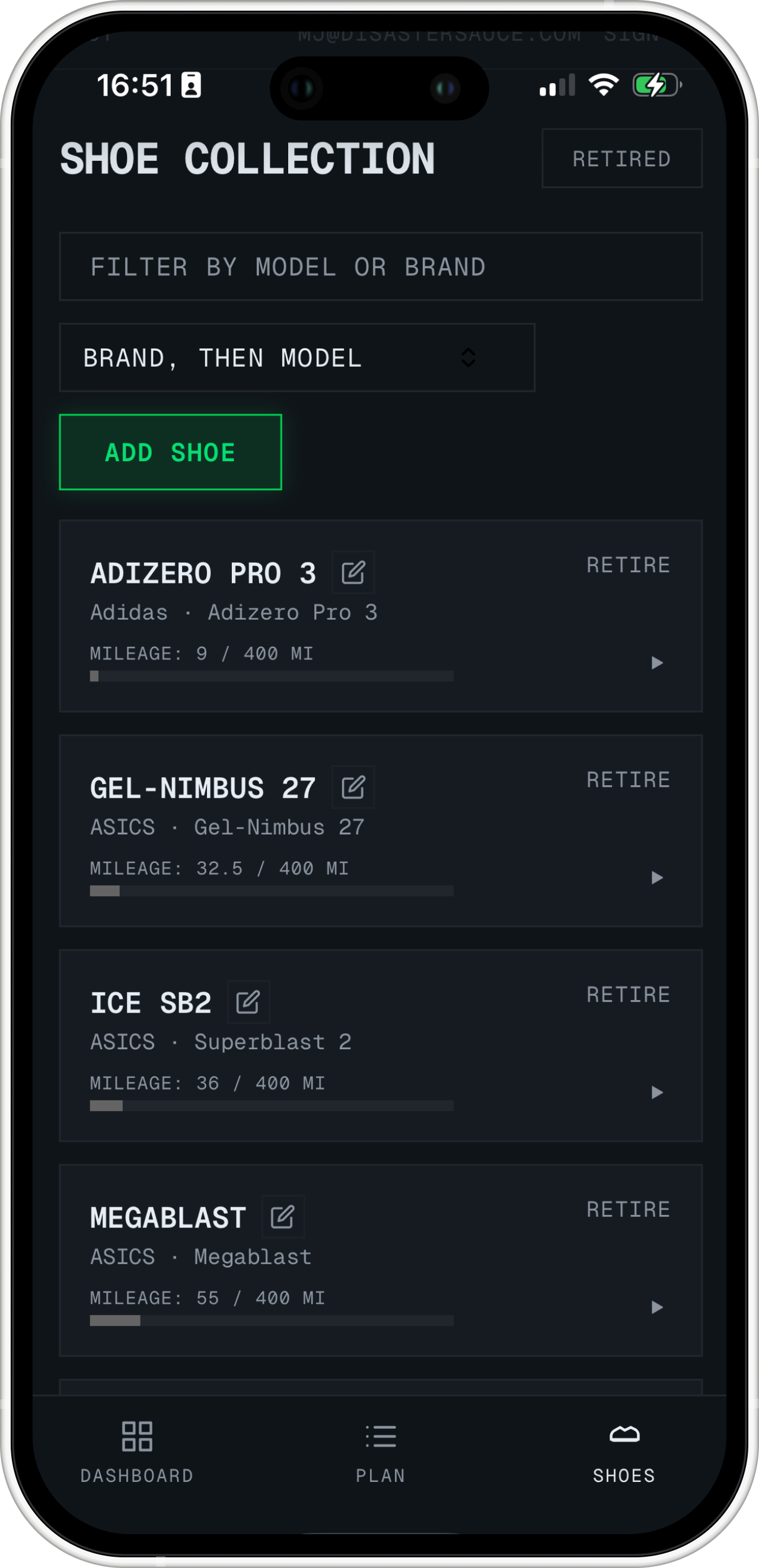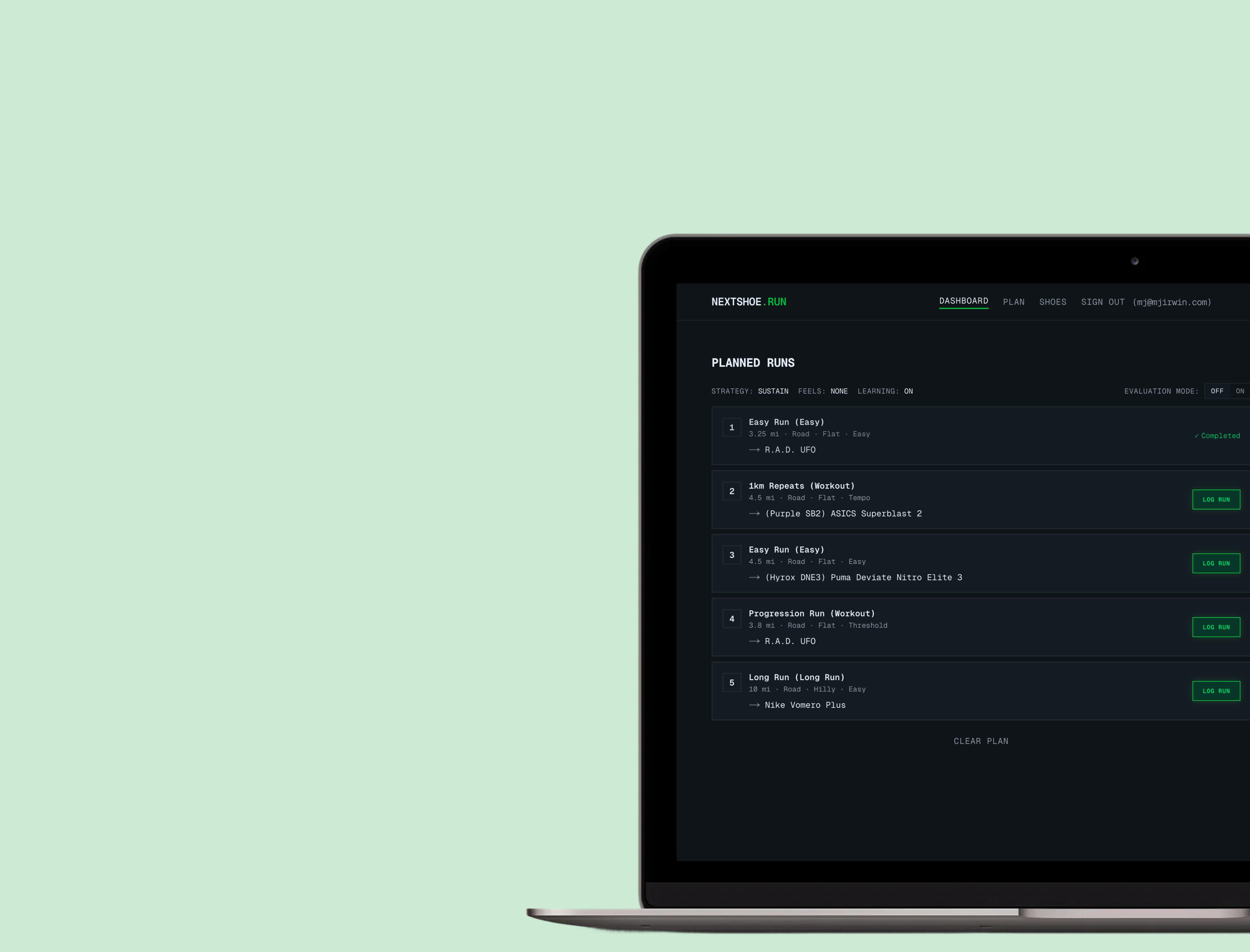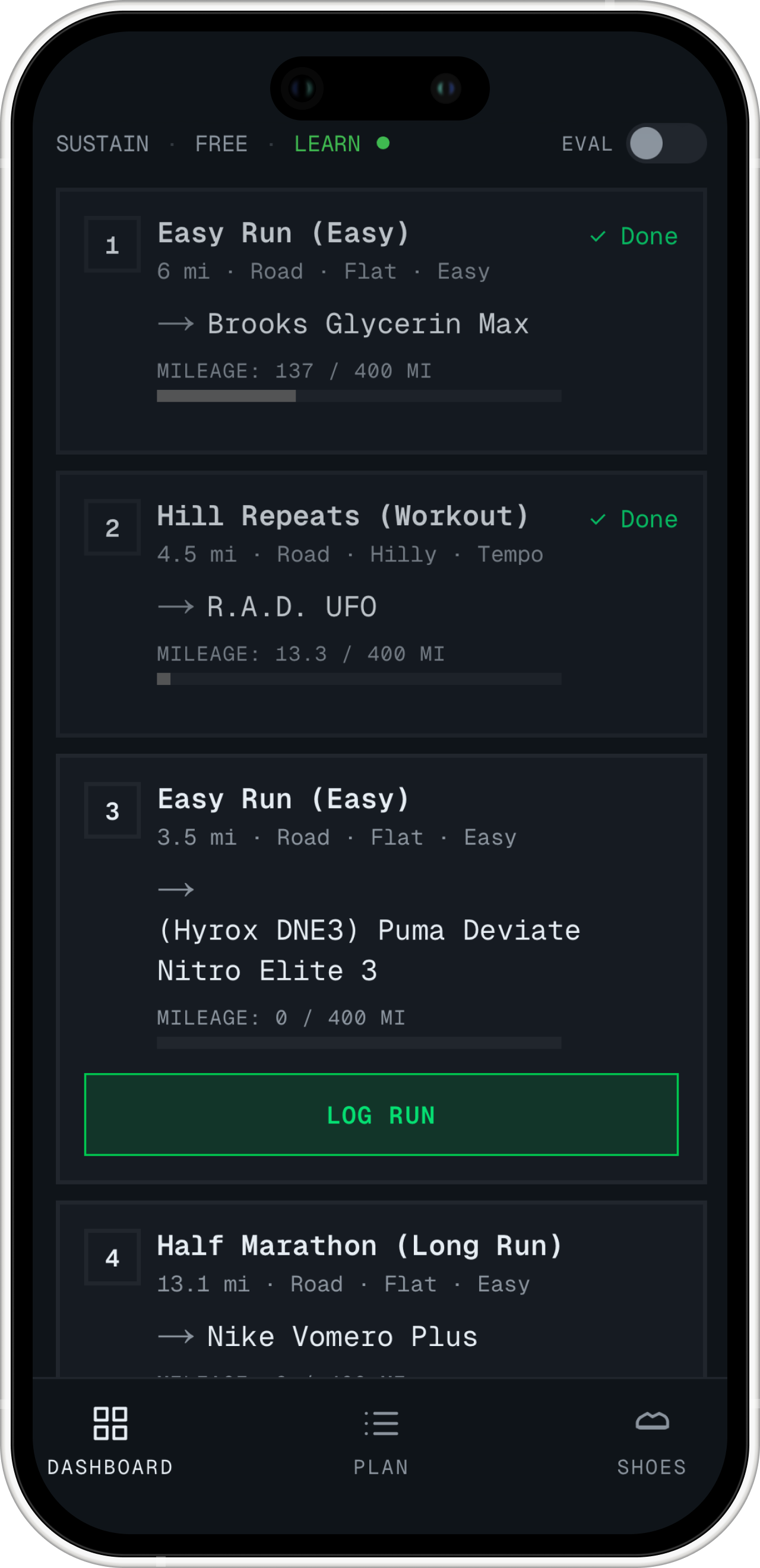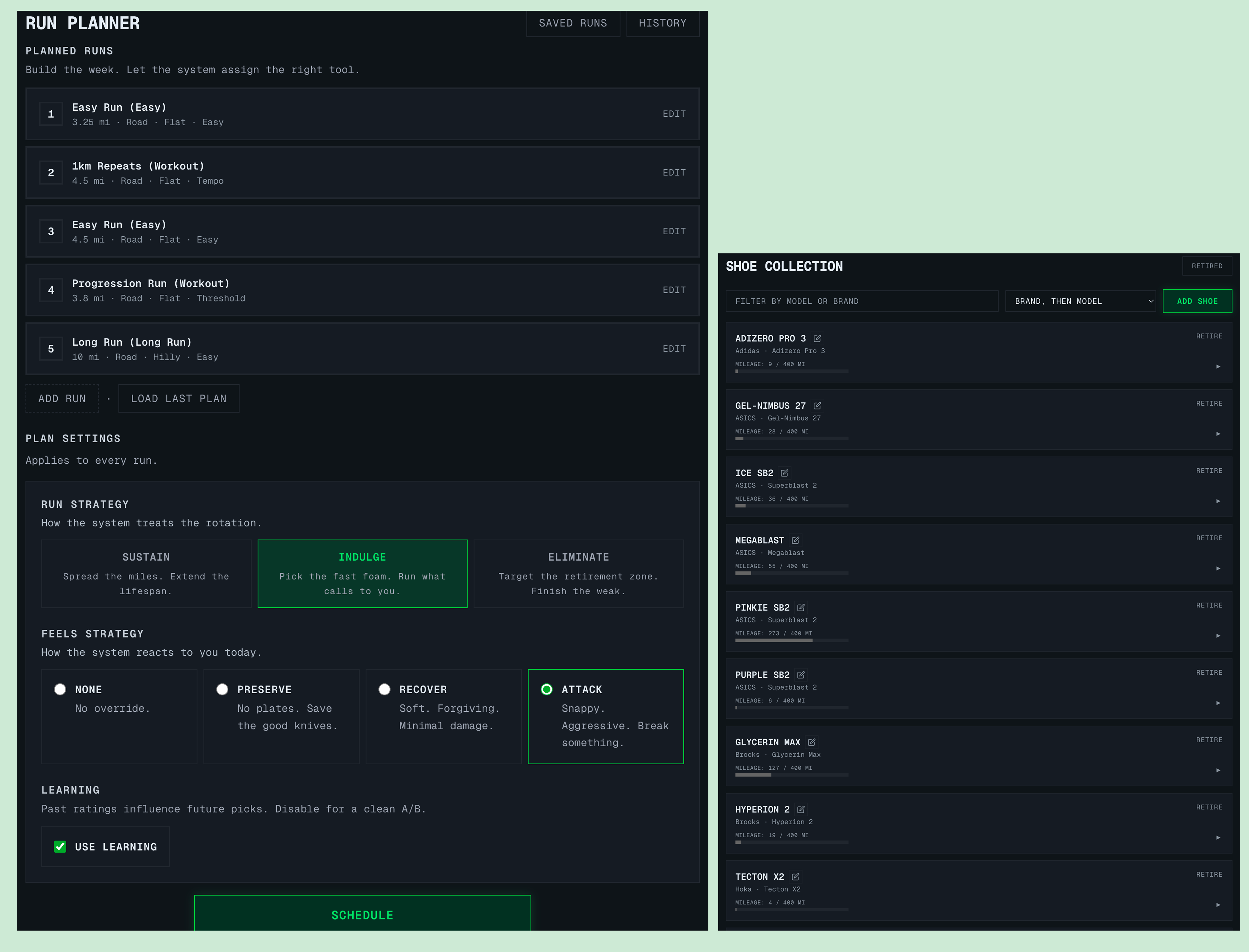 Runners who care about their gear don’t have a good tool for tracking shoe performance over time. Strava tracks mileage. That’s it. No system learns which shoe works for which run, accounts for how a shoe feels as it ages, or recommends rotation based on actual performance history.