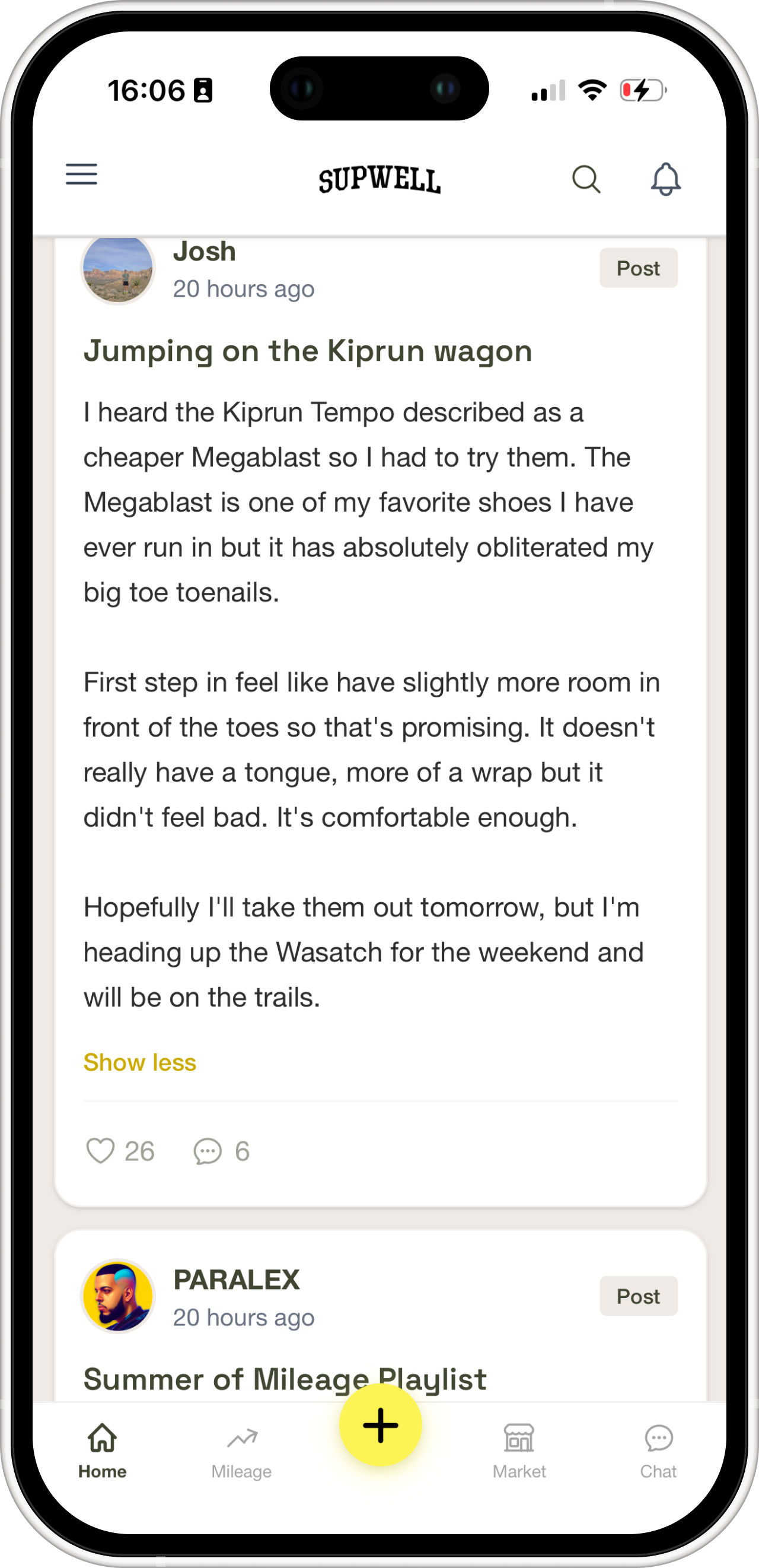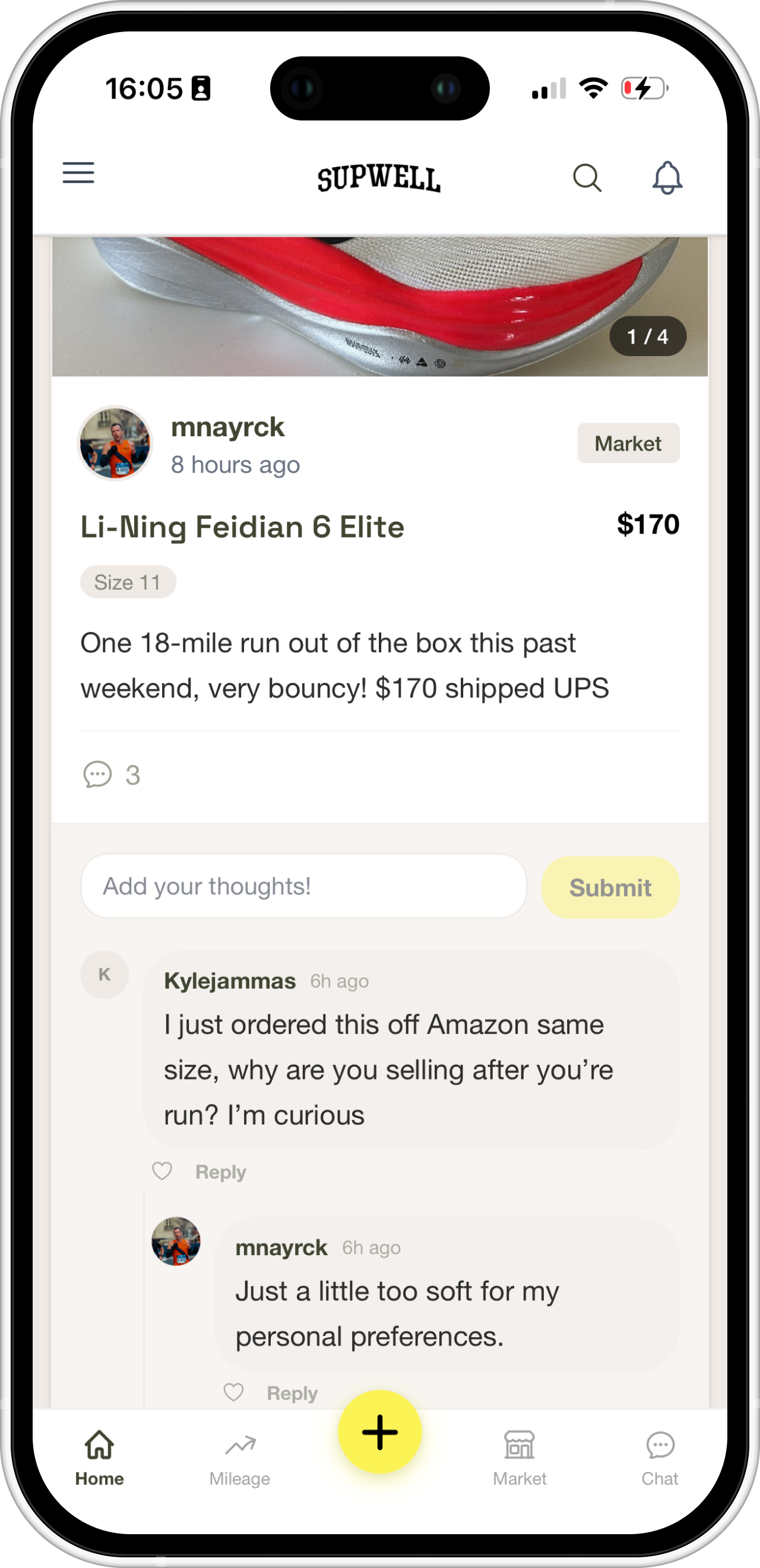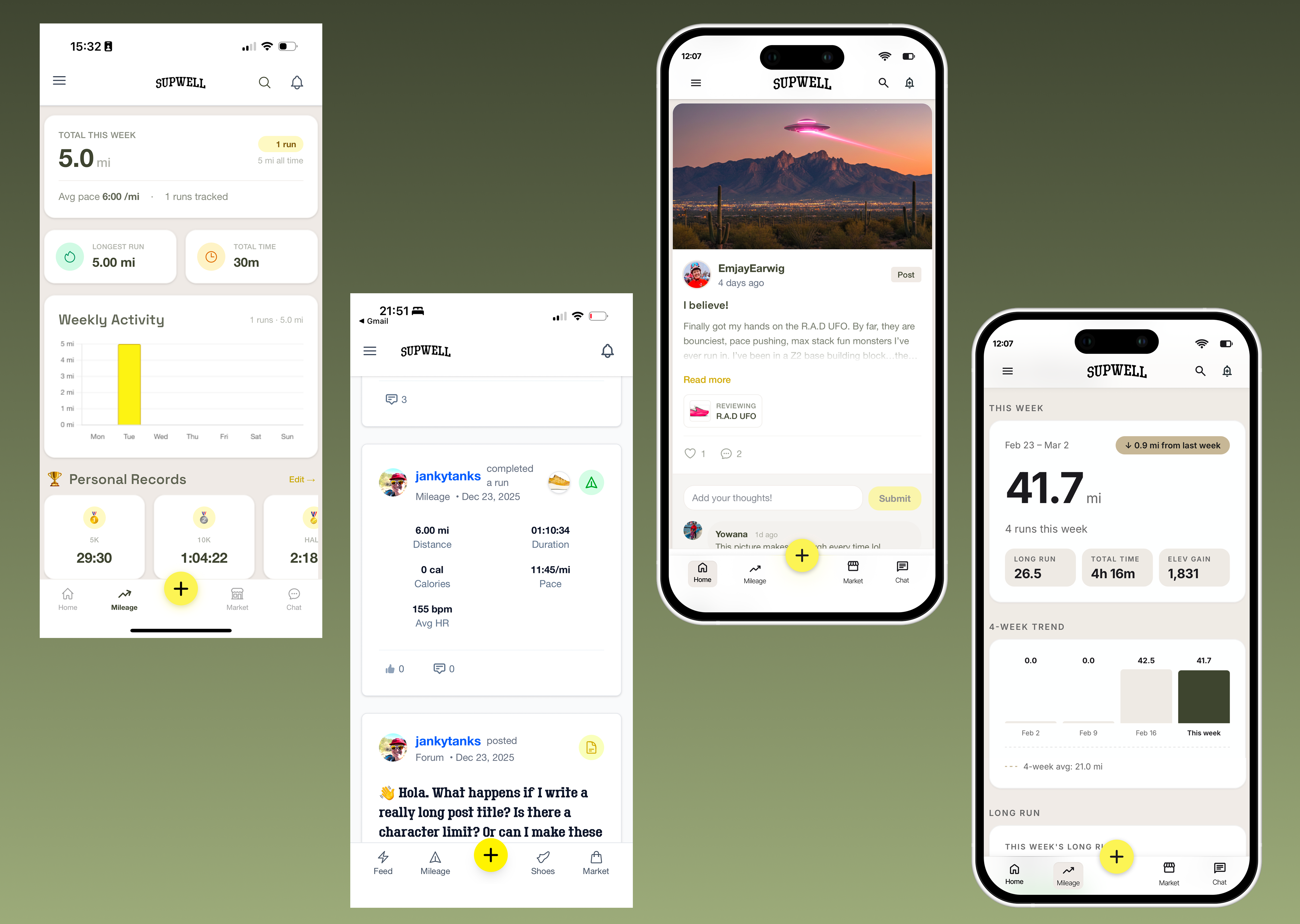 Supwell is a running community app — shoe tracking, social feed, and a peer-to-peer marketplace for used running gear. The founder builds in public, sharing development progress with an active beta community in real time.